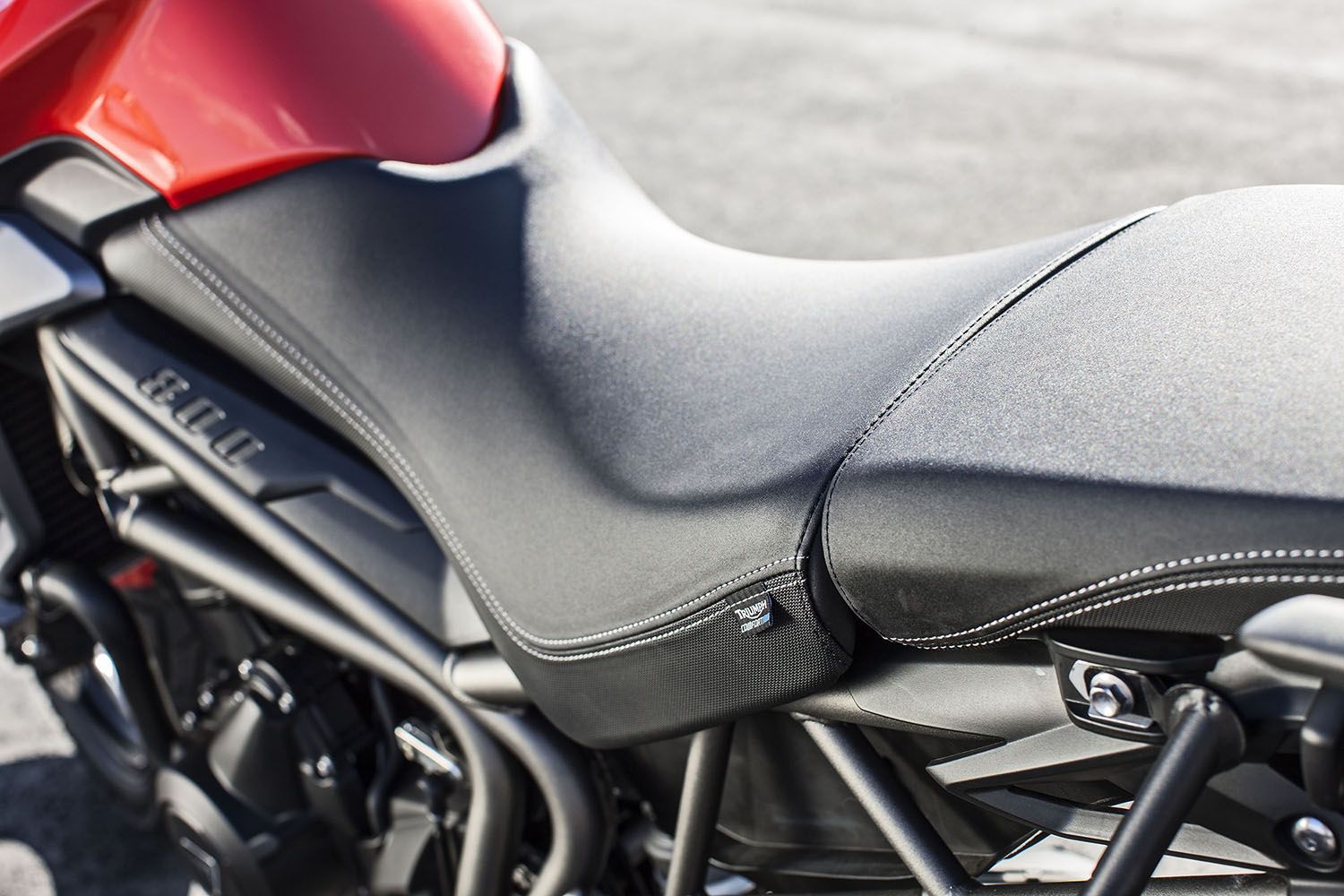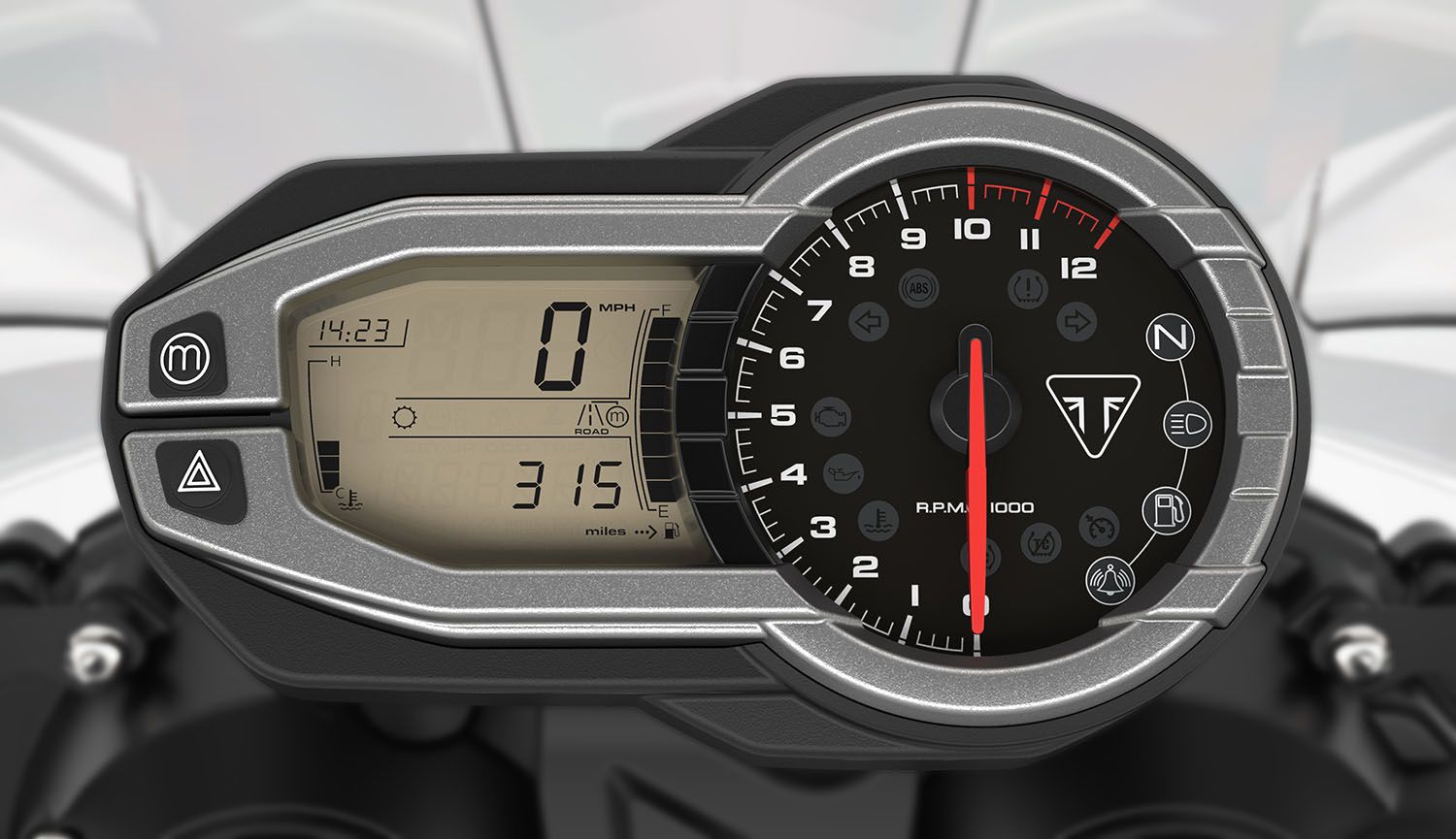| Panel de Instrumentos y Funciones | Cuadro de instrumentos con tacómetro analógico, doble display LCD: fijo y multi-función. El display fijo muestra la información de velocidad, marcha engranada, nivel de combustible, aviso de mantenimiento, reloj, temperatura ambiente y temperatura del líquido refrigerante, estado del control de velocidad y velocidad marcada. El display LCD multi-función muestra el estado y permite seleccionar los cinco Modos de Conducción (Rain, Road, Off-Road, Sport y Rider), ajuste de la pantalla, configuración de la suspensión (TSAS), ordenador de a bordo (distancia recorrida, tiempo en marcha, consumo medio y velocidad media), odómetro, aviso de autonomía, consumo instantáneo, menú de ajuste y estado del TPMS (sistema de control de la presión de neumáticos) y los puños y asientos calefactables. |