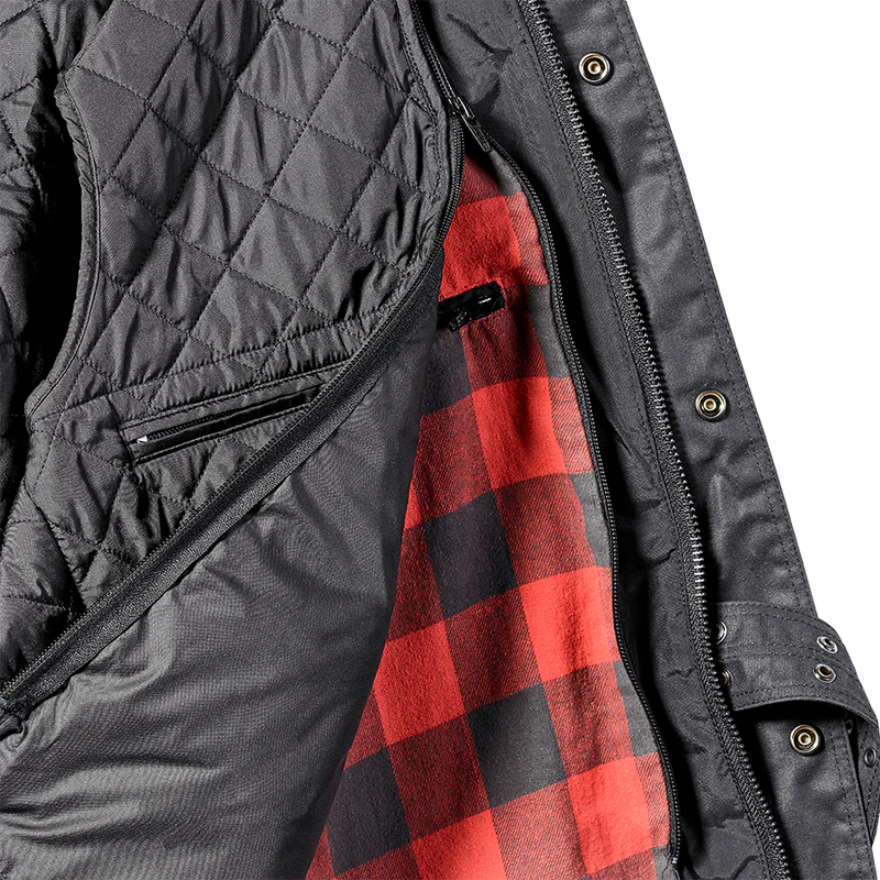 Chaqueta 100 % algodón encerado, con protectores extraíbles con certificación CE, seis bolsillos, forro acolchado extraíble y un diseño de espalda elástica para mayor comodidad mientras conduces. La construcción interna diseñada es resistente a la abrasión.