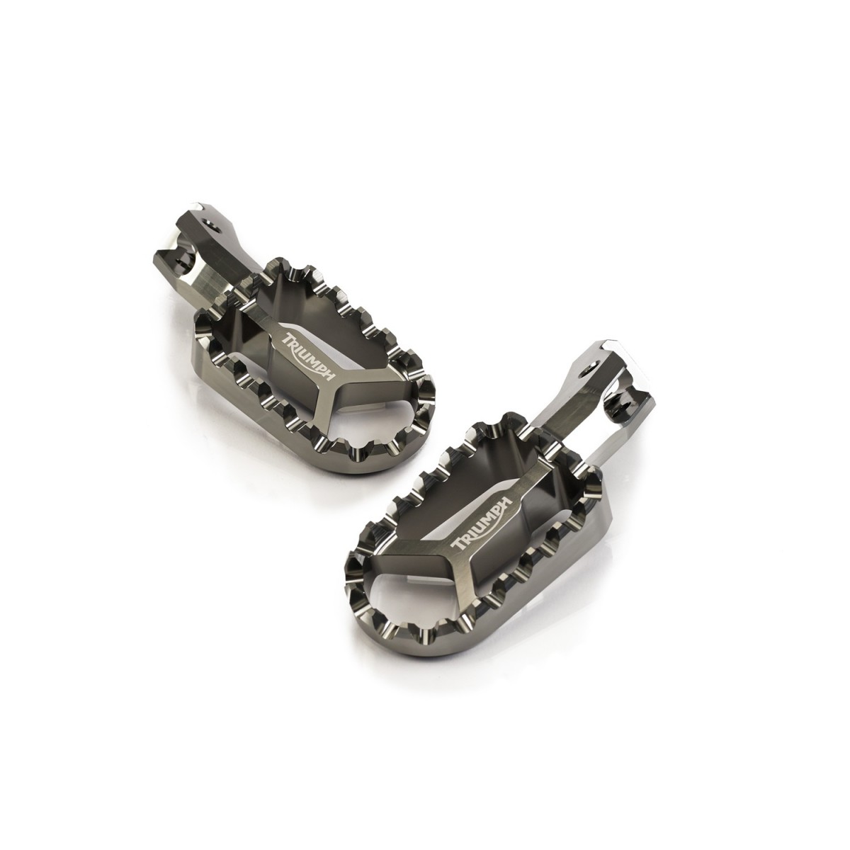 Estriberas anodizadas en color gris grafito, fabricadas mediante mecanizado CNC en aluminio 7075 T6, utilizado en la industria aeroespacial. Ofrecen un punto de apoyo más ancho para los pies y aportan una mejor estabilidad en terrenos desiguales.