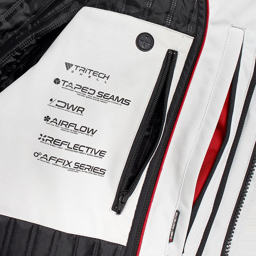 La chaqueta de moto Triumph Tourer Lite en blanco, negro y rojo es una opción de primera línea para los motociclistas que buscan un rendimiento y un estilo excepcionales. Esta chaqueta, confeccionada con tejido de rendimiento TriTech 3L, ofrece impermeabilidad y transpirabilidad superiores, lo que garantiza que te mantendrás seco y cómodo en cualquier condición climática. El tejido de color claro está tratado con un revestimiento de teflón, que repele la suciedad y mantiene una apariencia limpia. Diseñada teniendo en cuenta los mercados más cálidos, esta chaqueta es perfecta para los motociclistas que exigen tanto funcionalidad como moda. Esta versátil chaqueta viene repleta de características para mejorar tu experiencia de conducción. Cuenta con un forro interno fijo de malla transpirable AirFlow, que te mantiene fresco y bien ventilado durante los viajes largos. El forro de aislamiento térmico extraíble proporciona calidez adicional cuando es necesario, lo que la hace adecuada para diversas condiciones climáticas. La chaqueta Triumph Tourer Lite también es compatible con la serie Affix de Triumph y los jeans de motociclista, lo que te permite crear un traje técnico completo y personalizable. En lo que respecta a la ergonomía, esta chaqueta se destaca. Su construcción ergonómica garantiza la máxima comodidad durante la conducción, mientras que el ajuste de las mangas permite un ajuste personalizado y la colocación adecuada de los protectores. La función de ajuste de la cintura mejora aún más el ajuste, proporcionando una sensación cómoda y segura. Con su tejido exterior TriTech de 3 capas y revestimiento de teflón, esta chaqueta no solo ofrece una excelente protección, sino que también repele la suciedad, manteniendo su aspecto fresco y limpio. La seguridad es primordial y la chaqueta Triumph Tourer Lite no decepciona. Viene equipada con protectores de hombros y codos AirFlow D3O de perfil bajo con certificación CE, que ofrecen una protección invisible pero efectiva. El protector de espalda AirFlow D3O BP4 extraíble y mejorado proporciona una protección adicional. Para mayor tranquilidad, existe la opción de insertar un protector de pecho D3O. La chaqueta también cuenta con detalles reflectantes para una mayor visibilidad en la carretera. La chaqueta de moto Triumph Tourer Lite es una prenda de alto rendimiento diseñada para motociclistas que priorizan la comodidad, la protección y el estilo. Sus características avanzadas, su construcción duradera y su compatibilidad con otros productos Triumph la convierten en una opción versátil para cualquier motociclista. Elige esta chaqueta para mejorar tu experiencia de conducción